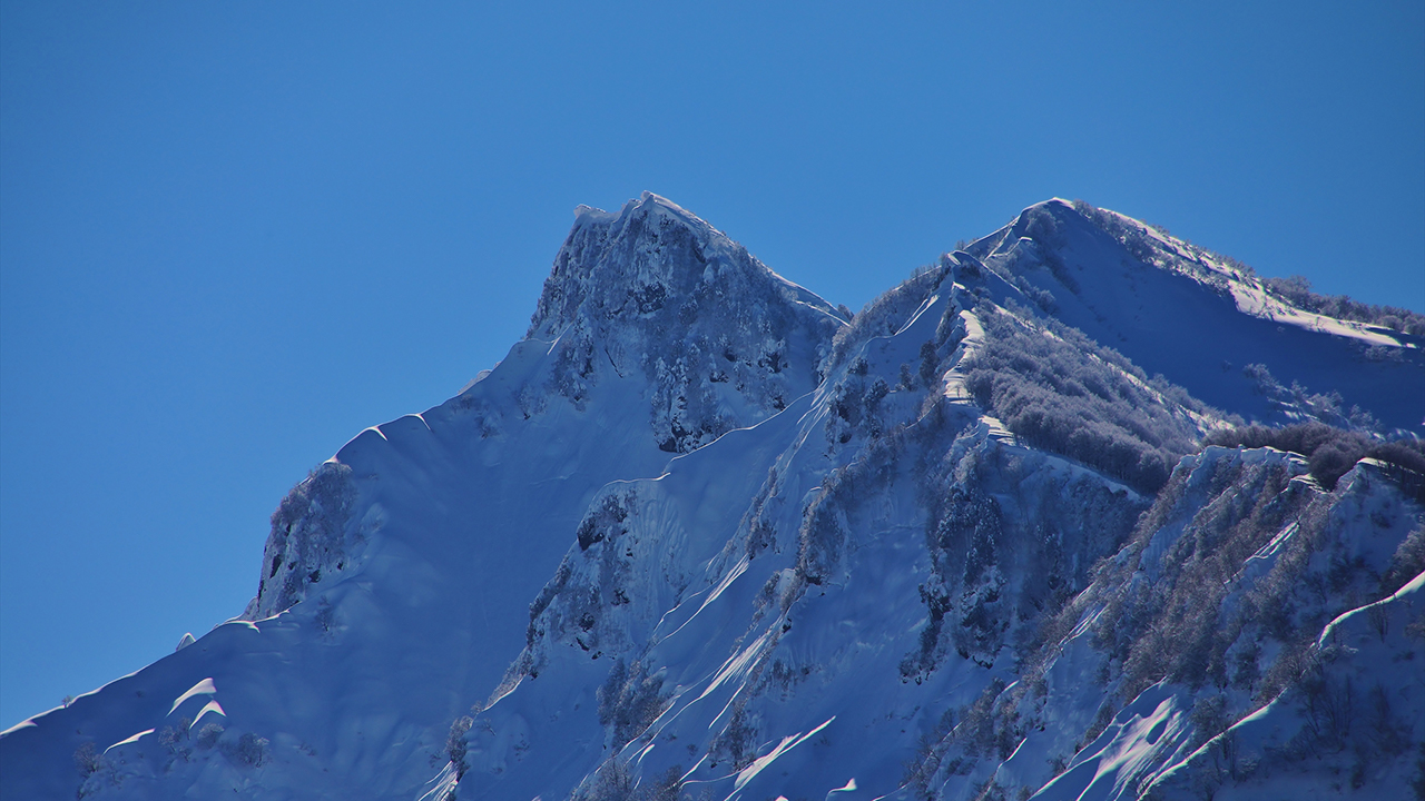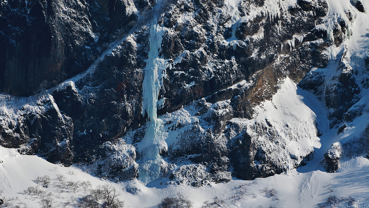 雪に覆われた山々と青く澄んだ海が、まるで天と地が触れ合うかのように広がっています。